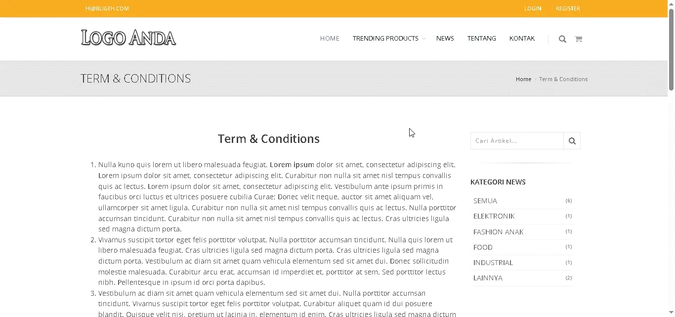 Telah lengkap dengan fitur standar website lainnya seperti halaman FAQ, Kontak, Policy dll.